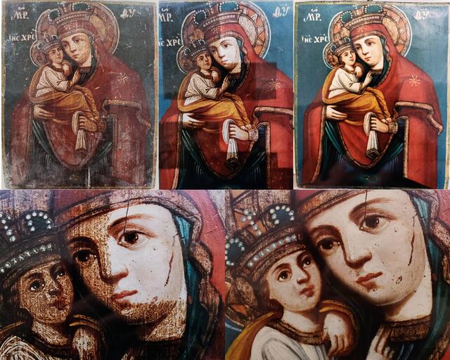 The restoration process is slow, delicate work. Dovgan has restored icons in private collections, like this 19th-century icon of the Madonna with Child, done in oil paint on unprimed wood.