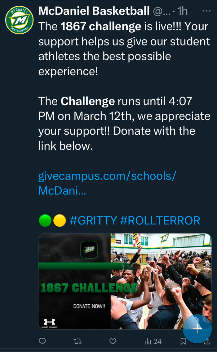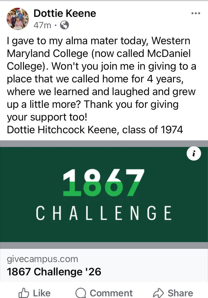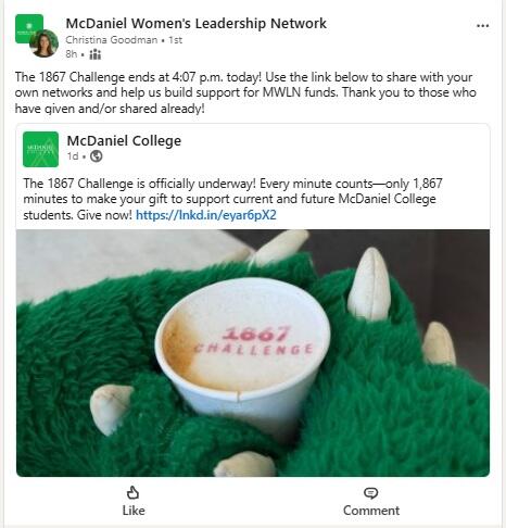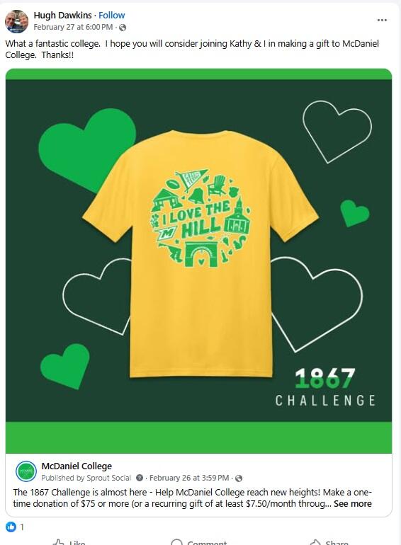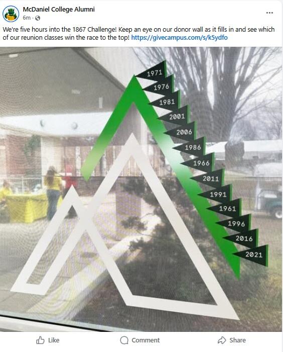During the 1867 Challenge, faculty, staff, students, alumni, family members, friends, and supporters come together to show their Green Terror pride and make an impact for current and future McDaniel students.