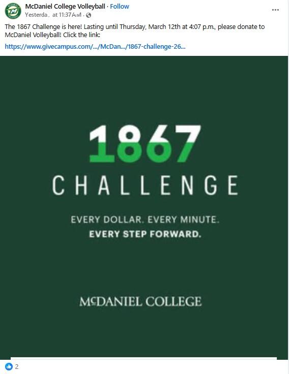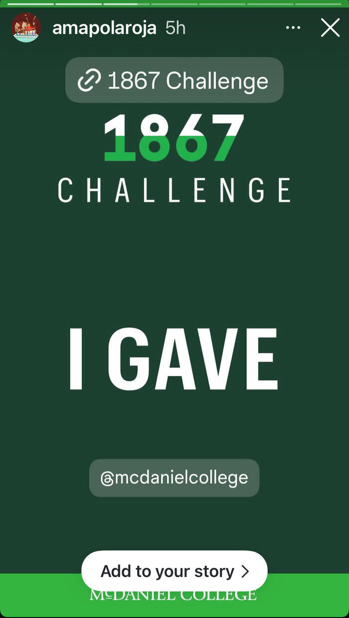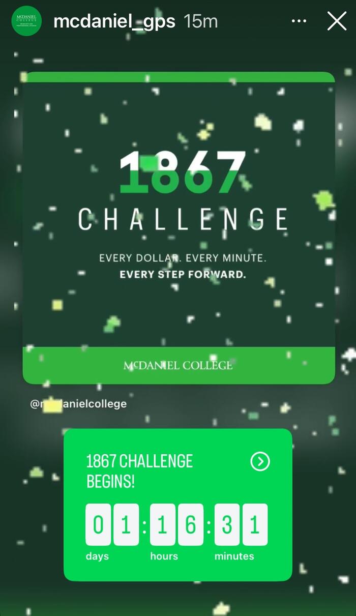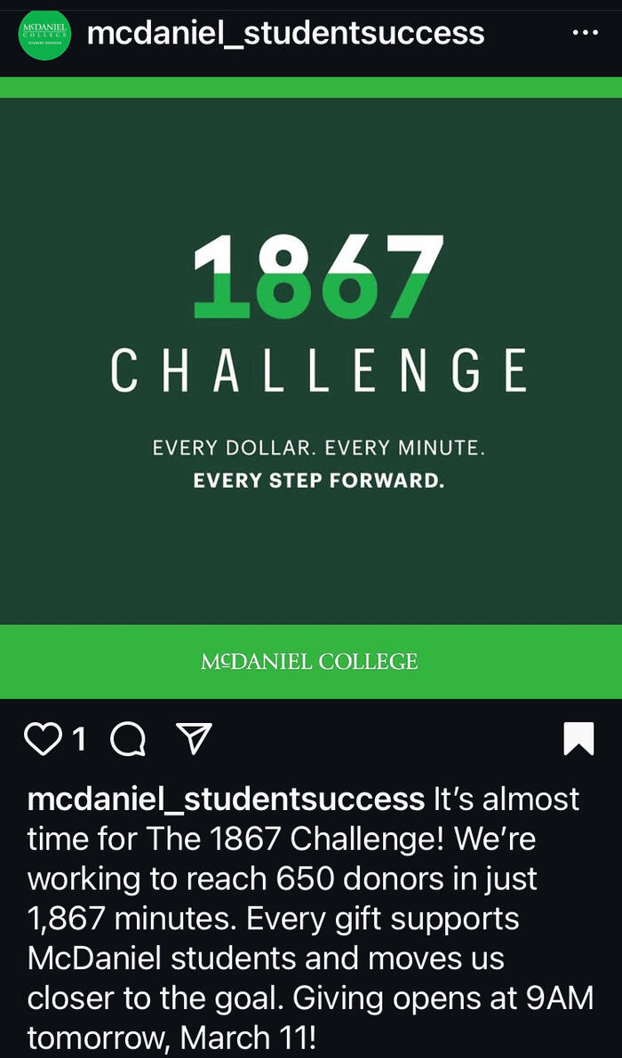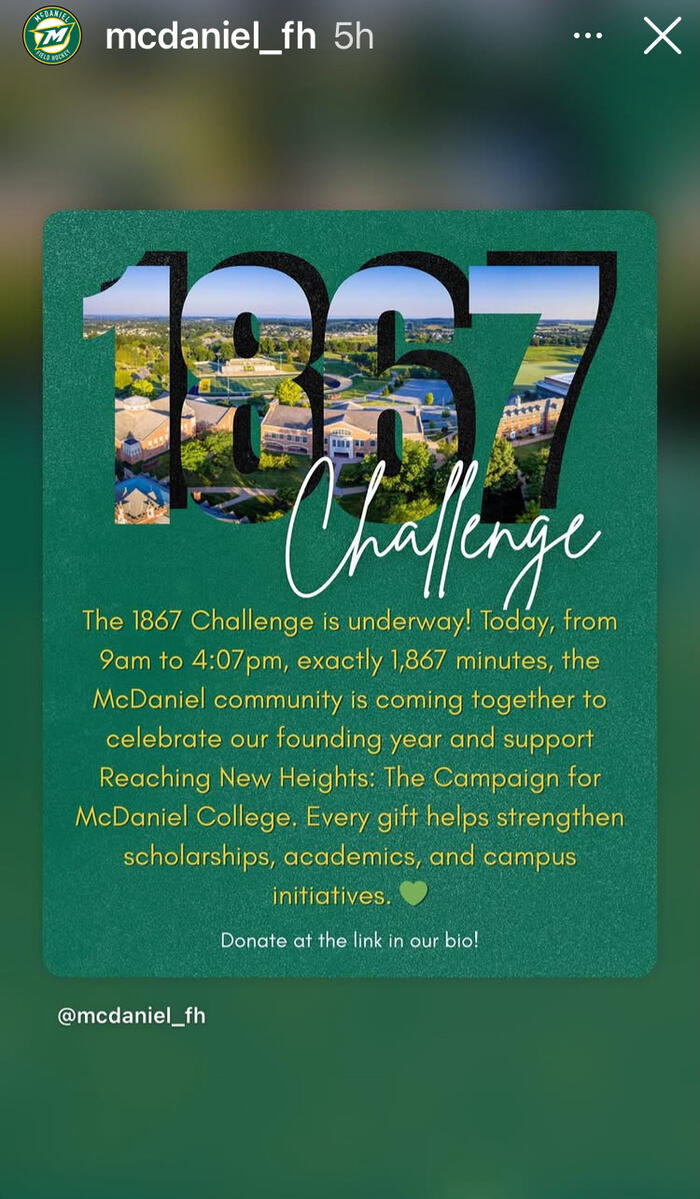 Alumni, parents, faculty, staff, students, and friends showed their support for current and future McDaniel students during the 1867 Challenge, McDaniel College's annual giving campaign. The entire McDaniel community came together to raise $378,152 from 522 donors in 1,867 minutes to honor the college's founding year as part of "Reaching New Heights: The Campaign for McDaniel College."