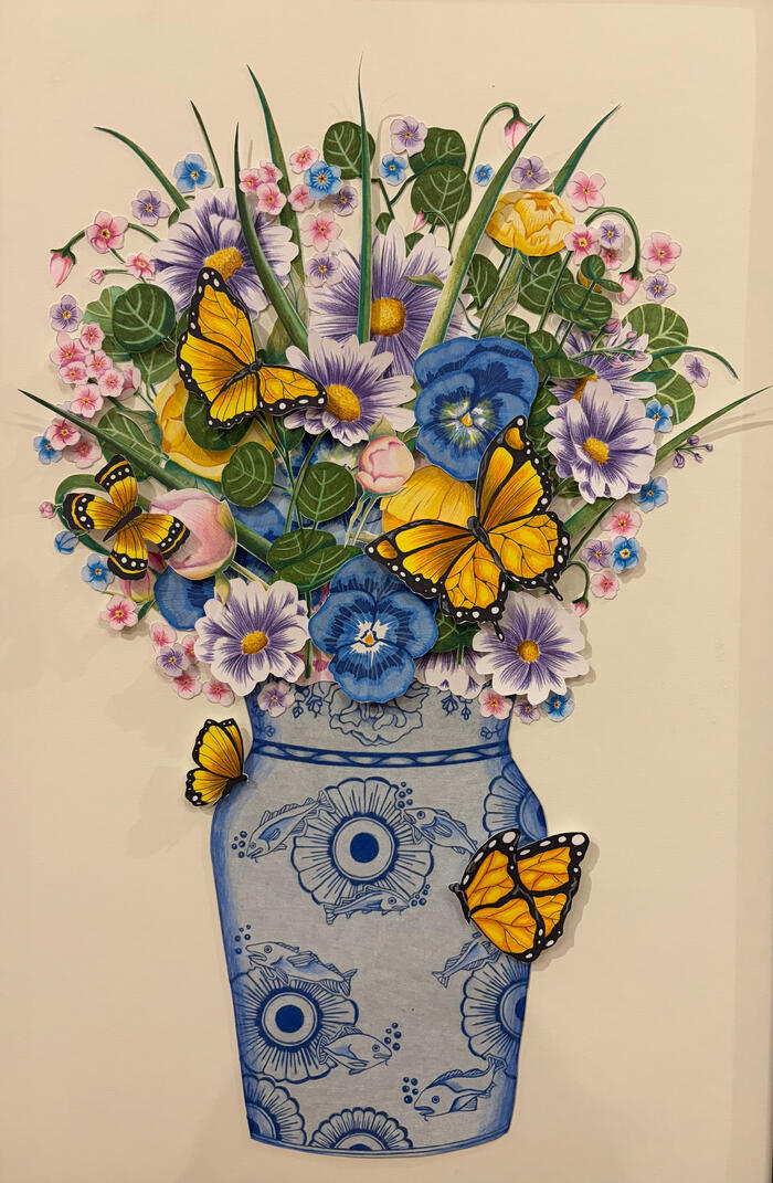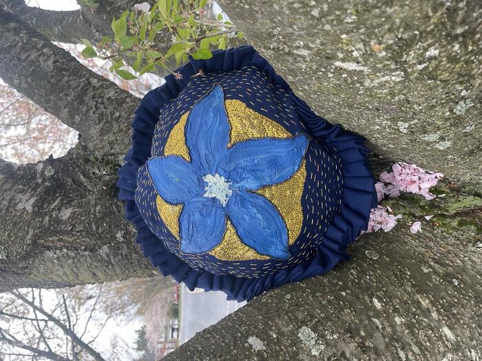 Conny Spiess, a senior Art major from Germantown, Maryland, is a fiber artist who says that they use the skills of sewing and embroidery passed down by generations of mothers in their family to guide the creation of their work. Spiess is also inspired by their Austrian heritage and specifically the plants and flowers that grow in the Alps. “My work magnifies the delicate forms of plants to highlight the beauty we risk losing to the environmental crisis...,” Spiess said. “I create these pieces using repurposed fibers and scraps inherited from my mother and grandmother, utilizing textile skills passed down through four generations of women in my family. Through this practice, I bridge the ancestral craft with environmental advocacy to foster a more intentional, mindful connection to the natural world.”
