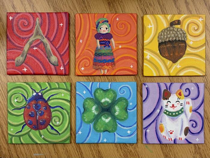 Maya Stone, a senior Art major from Mount Airy, Maryland, explores moments from her early childhood and other stages of life in her work. “I began looking at each stage of my life through the lens of metamorphosis... I continue to create self-portraits true to life but surround myself with illustrative visuals. I select vibrant colors and kitschy imagery as a way to call back to visual themes from girlhood,” Stone said.