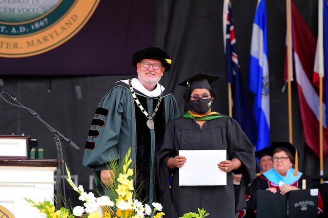 Outside among family and friends, the McDaniel College Class of 2021 – 587 bachelor’s and master’s candidates in all – crossed the stage to receive their degrees May 22 during the college’s 151st Commencement ceremony. Mary Lynn Durham '70 and Bill Roj '70, who were recognized with honorary Doctors of Laws degrees, served as the commencement speakers.