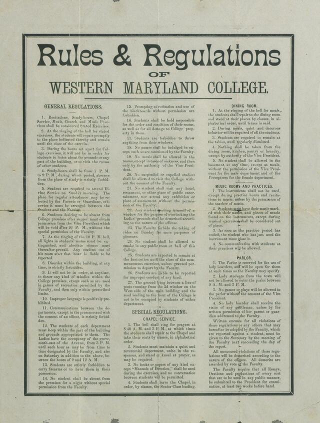 These rules and regulations, circa the late 1800s, offer a snapshot of the college’s earliest era as one of the first coeducational institutions in the nation. Characterized by curfews, mandatory dinners, and strict rules for male and female student comingling, the early college is unrecognizable from today’s after more than a century of change.