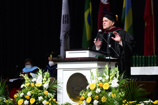 President Jasken then welcomed the 2022 Graduate Commencement speaker Dan Rodricks to the podium. In addition to serving as the keynote speaker, Rodricks was conferred an honorary Doctor of Journalism degree for his dedication to the pursuits of journalism.