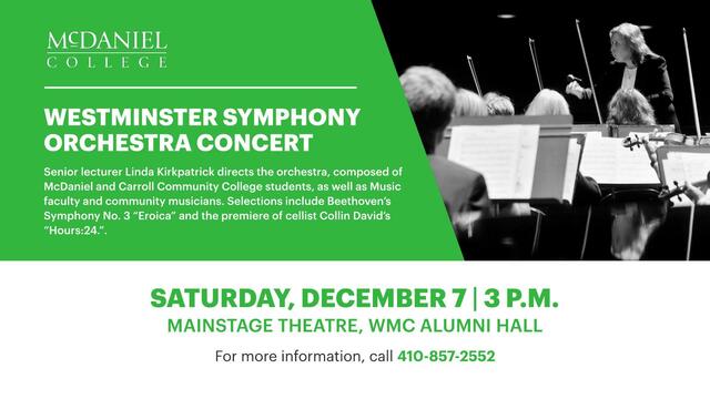 The Westminster Symphony Orchestra Concert takes place Saturday, Dec. 7, at 3 p.m. in WMC Alumni Hall’s Mainstage Theatre. Directed by Linda Kirkpatrick, senior lecturer in Music, the Westminster Symphony Orchestra includes McDaniel and Carroll Community College students, as well as Music faculty and community musicians.