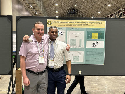 Khaleel Lee presented a poster on research titled "Co(III) Schiff-base complex inhibitors of SARS-CoV-2 papain-like protease (PLpro)." Lee, a Biochemistry major from Columbia, Maryland, conducted this student-faculty research with Craig and senior Health Sciences major Victor Heasley.